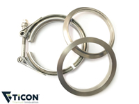 Ticon Industries Titanium V-Band Clamp Assemblies are available in the 3-piece, matching set in sizes 2.5", 3", 3.5" and 4" for use with Ticon titanium tubing. Includes 2 titanium flanges and matching stainless v-band clamp.